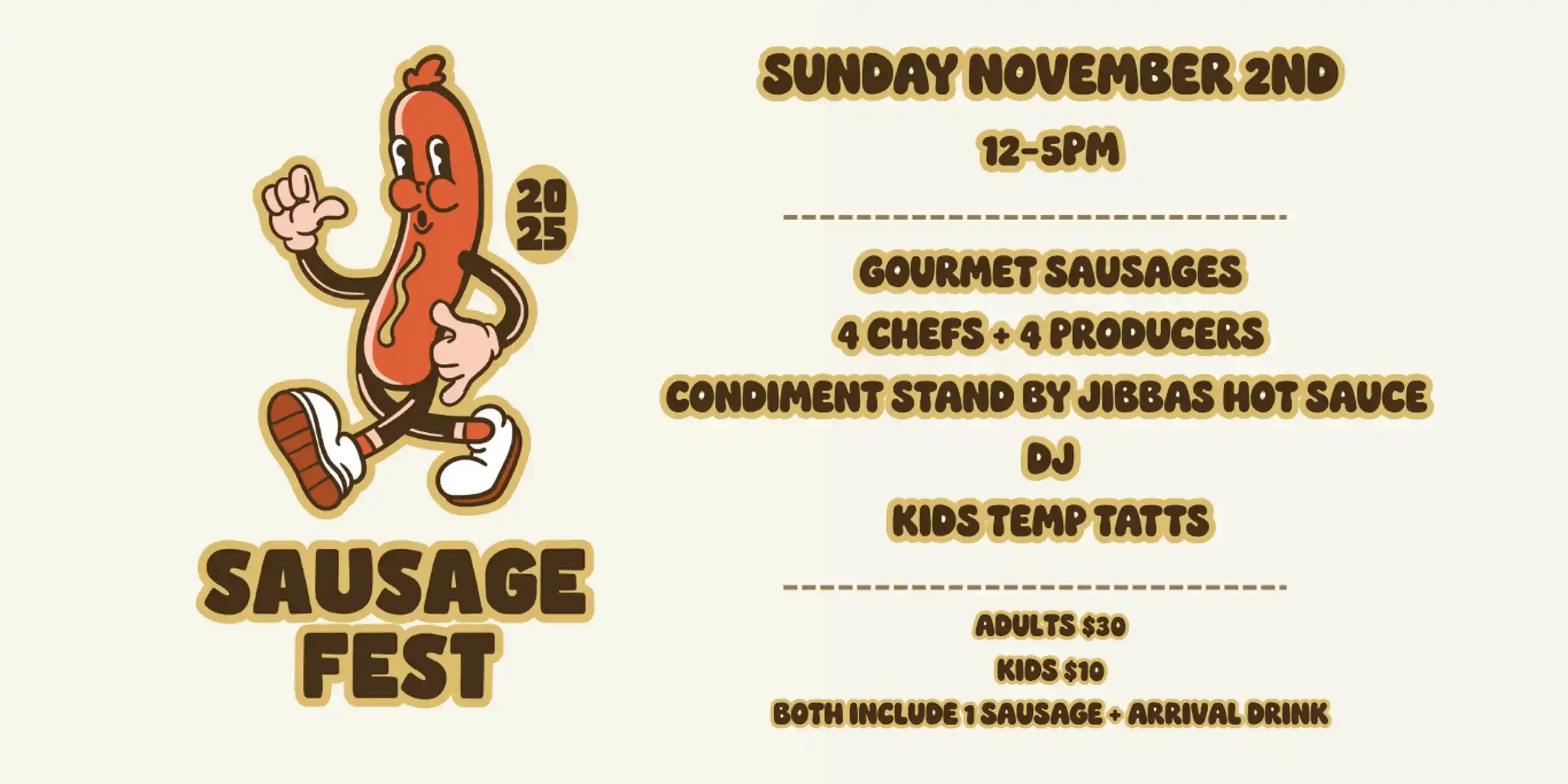 • Adults $30 – includes 1 gourmet sausage & arrival drink (more snags and drinks available to purchase!)